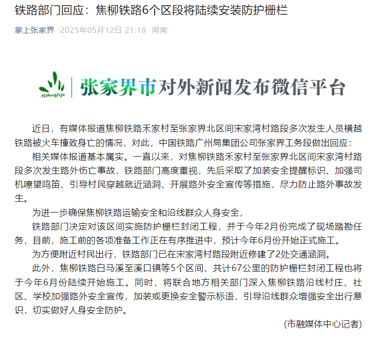 5月12日晚,“掌上张家界”微信大众号发布音讯称,近来,有新闻媒体报导焦柳铁路禾家村至张家界北区间宋家湾村路段屡次产生人员横越铁路被火车撞致身亡的状况,对此,我国铁路广州局集团公司张家界工务段做出回应: